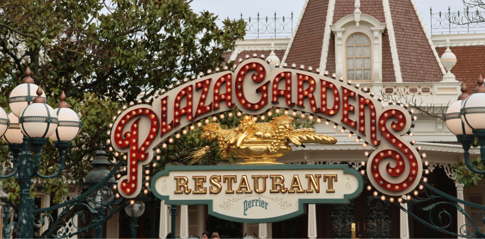 Plaza Gardens Restaurant is a buffet restaurant located in Disneyland Paris’ Disneyland Park, on Main Street USA. The restaurant offers a variety of international cuisine, with something for everyone, from traditional French fare to American specialties. Visitors can enjoy a wide variety of dishes, from meat and fish to vegetables and desserts, while taking in the magical atmosphere of Main Street U.S.A. With its elegant decor and view of Sleeping Beauty Castle, Plaza Gardens Restaurant is an ideal place for a lunch or dinner break with family or friends. What’s more, if you’d like to dine with the characters, you can reserve a table for dinner.